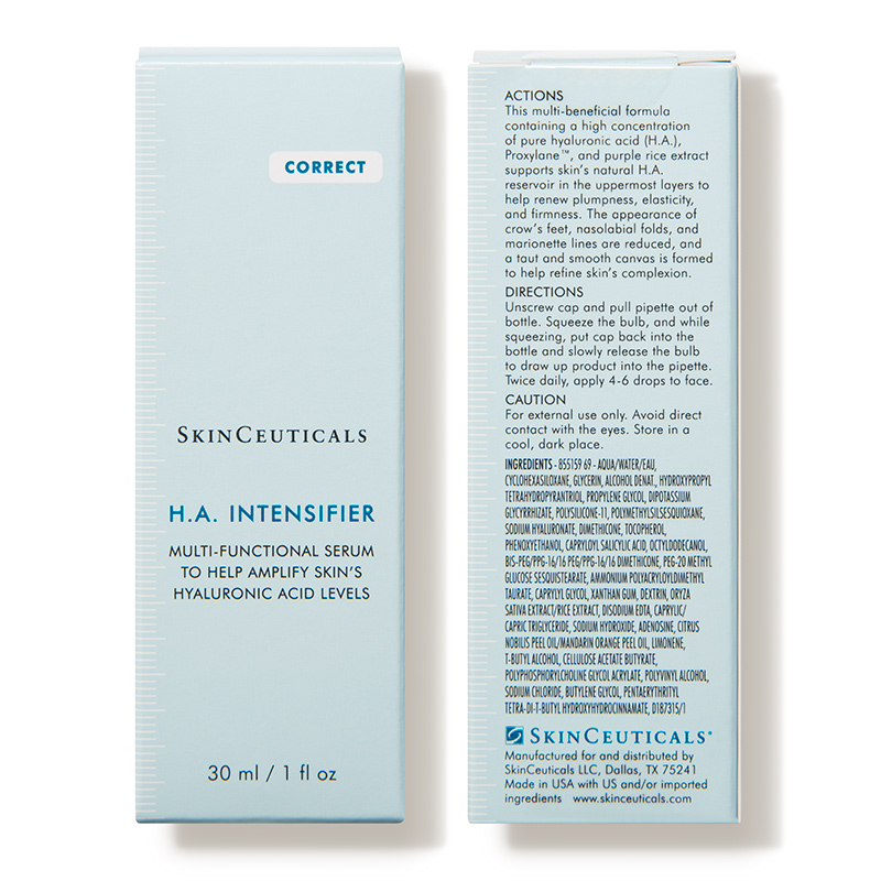 Hyaluronic Acid Intensifier (H.A.) Intensifier is a multi-beneficial corrective serum proven to amplify skin’s hyaluronic acid levels. This unique formulation contains a high concentration of pure hyaluronic acid, proxylane™, and botanical extracts of licorice root and purple rice to support skin’s hyaluronic acid levels and deliver surface hydration, helping improve the visible appearance of firmness, smoothness, and facial plumpness. This hyaluronic acid serum may be used as part of a home skincare regimen after dermal fillers; always consult with your physician for individual at-home advice.