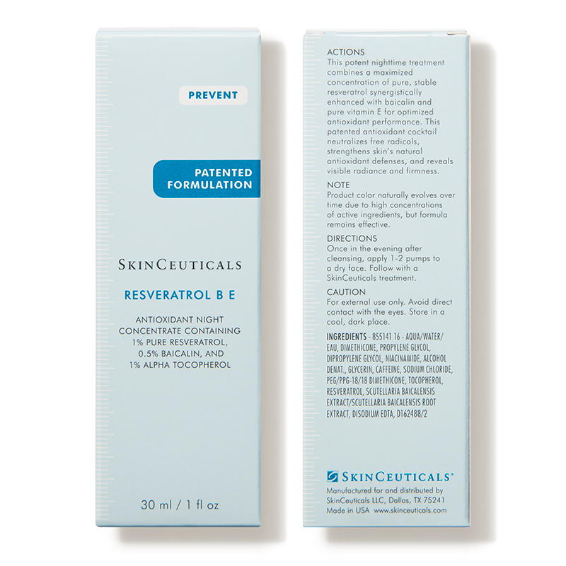 SkinCeuticals Resveratrol B E is a first-of-its kind night treatment that combines a concentration of pure, stable resveratrol with baicalin and pure vitamin E. The combination provides optimal antioxidant performance to prevent free-radical damage and signs of accelerated aging. This patented, antioxidant cocktail neutralizes free radicals, strengthens your skin’s natural antioxidant defenses and reveals visible radiance and firmness.