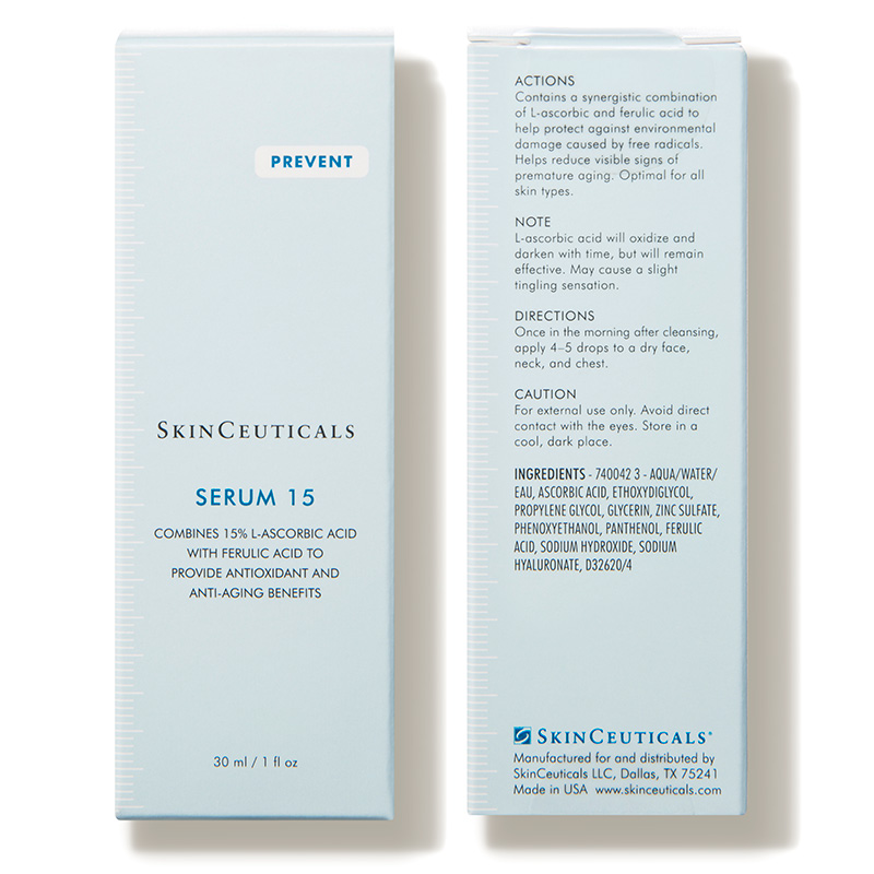 Complete your regimen with a SkinCeuticals sunscreen. When used together, Serum 15 AOX+ and broad spectrum sunscreens provide more comprehensive protection against visible aging caused by environmental aggressors.